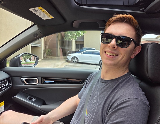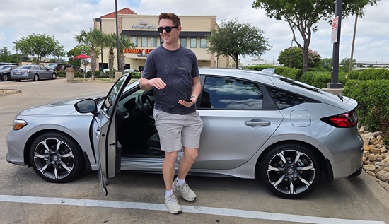 Cooper's new car. Honda Civic Hatchback Hybrid. It's really quick to drive and gets 50 MPG.
